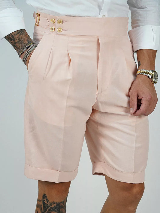 Bermuda in lino rosa con 4 bottoni e fibbie stringenti laterali