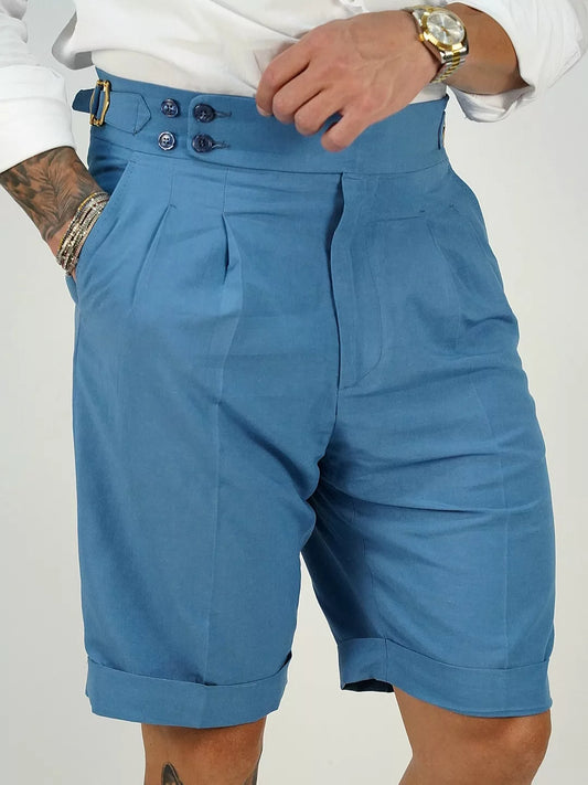 Bermuda in lino azzurro con 4 bottoni e fibbie stringenti laterali