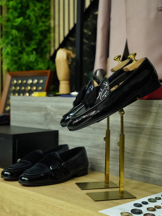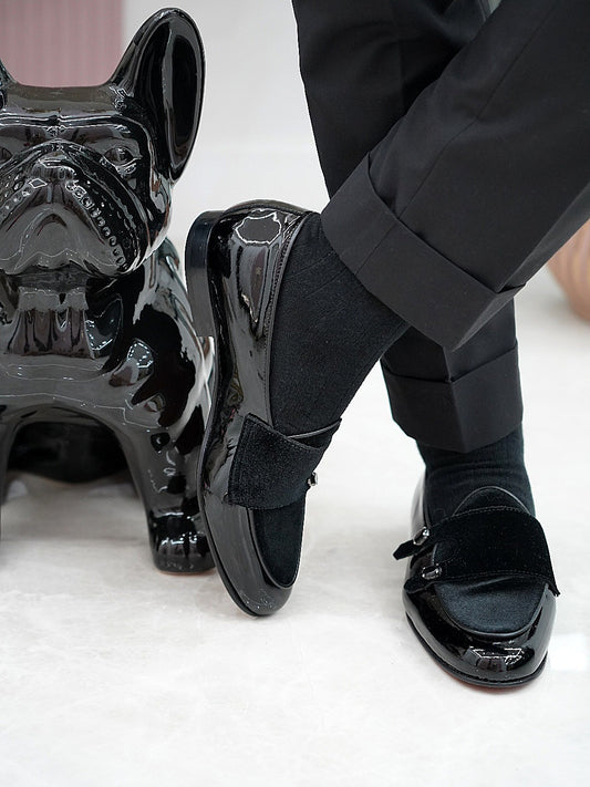 Mocassini doppia fibbia Vernice e Velluto Nero con applicazioni in pietra