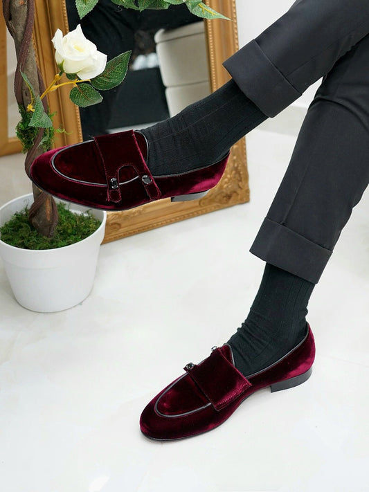 Mocassini doppia fibbia Velluto Bordeaux con applicazioni in pietra