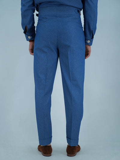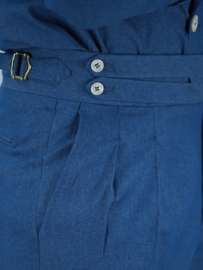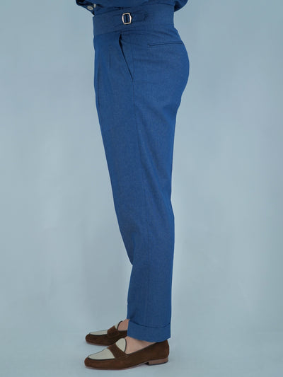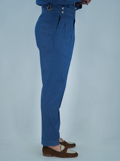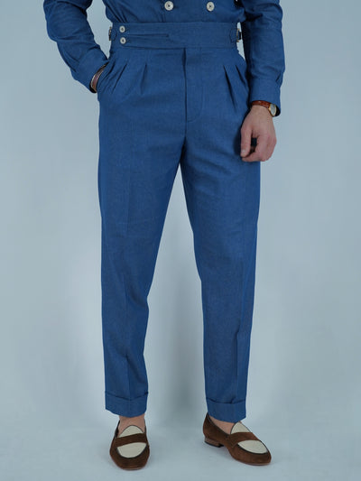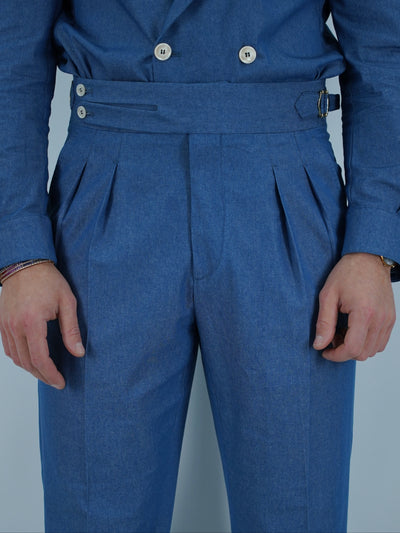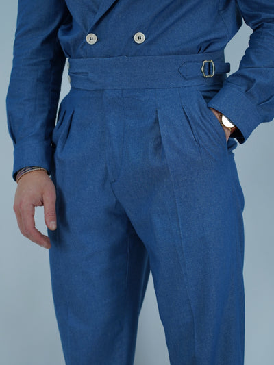 Gurkha biforcato effetto jeans lavaggio chiaro con fibbie stringenti laterali